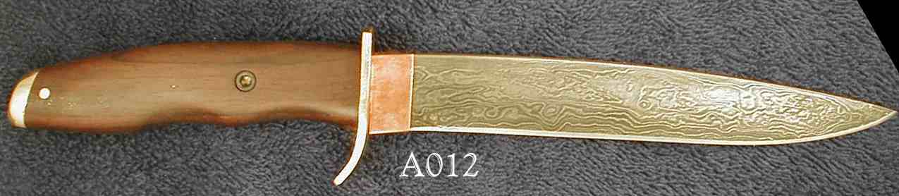| Blade Characteristics Steel Type: Damascus Composition  : O1/L6/203E/WI Billet #  : ? Number of Layers: ~500 Pattern: Random Etch: Medium Polish: 600-1200 Dimension (inches) Length: 6 Max Thickness: 1 Min Thickness: 1 |