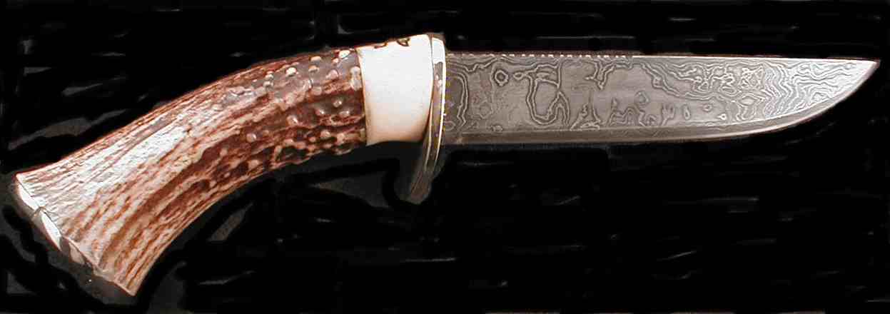 | Colt' Bowie (due to the shap of the handle). This blade is composed of random pattern Damascus. The grip is stag and vegetable-ivory It is currently serving next to a six-shooter with an Old West re-enactor. |