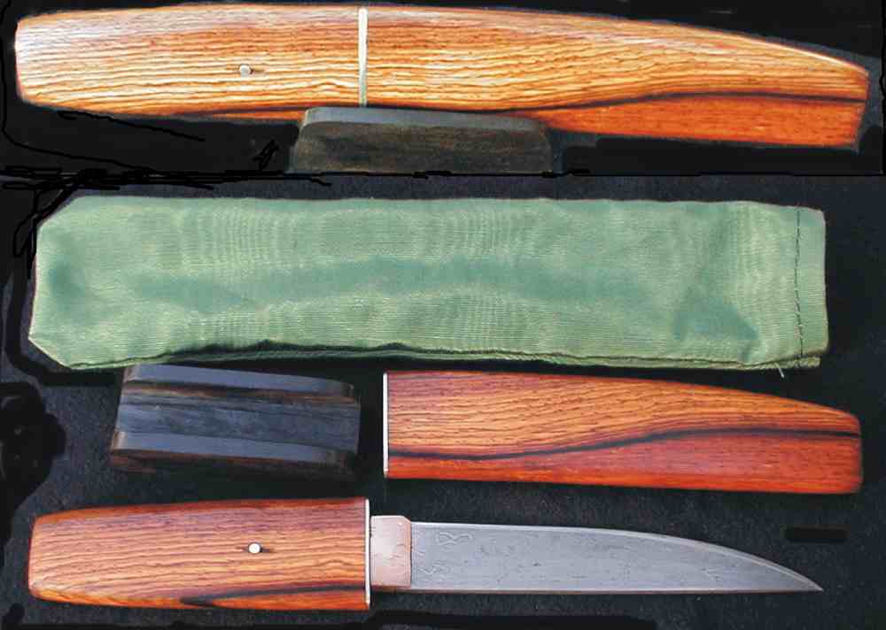 | Ebony stand and 'sword' bag included. Shirasaya is made from a single cocobolo piece. |