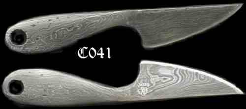 | Blade Characteristics Steel Type: Damascus Composition  : O1/L6/5160/203E/WI Billet #  : 3-Sep Number of Layers: 544 Pattern: Random Etch: Medium Polish: 600-1200 Dimension (inches) Length: 2.185 Max Thickness: 0.143 Min Thickness: 0.064 |