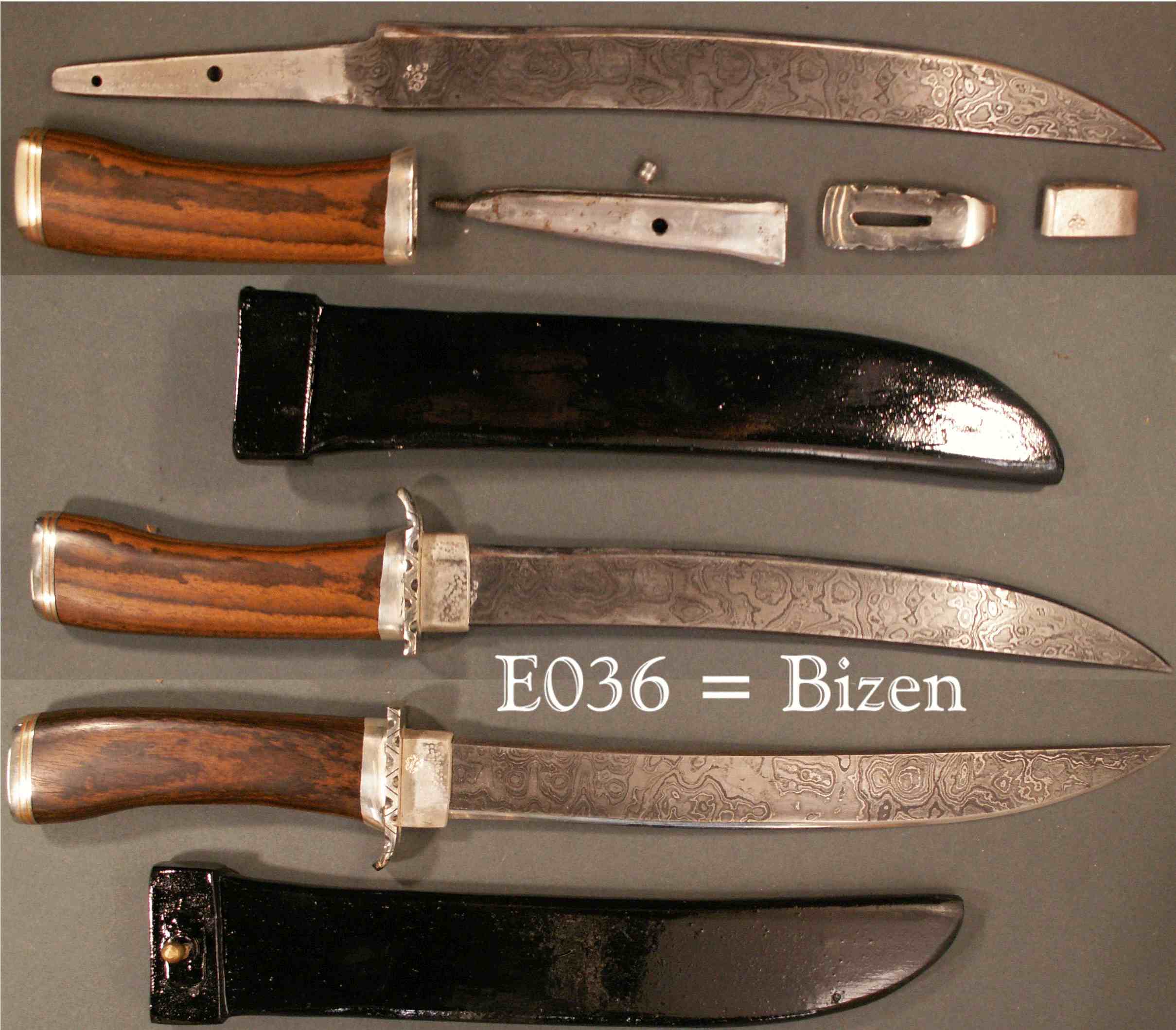 | Bizen = Nambam 2 - cast silver habaki & handle throat ring, simple mokume pommel, nickel silver guard with diagonal file pattern, wood sheath. The general shape and slimness reminds me of a friend's Bizen katana, hence the name "Bizen". |