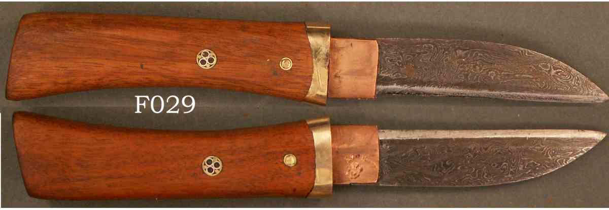 | Basket-weave damascus; guard and sheath ring are bronze and inlet into the wood; copper habaki; blade can be removed from handle |