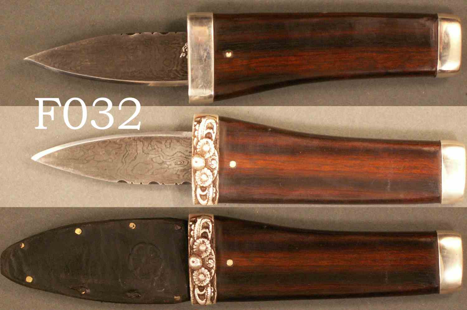 | Silver fittings overlay wood, pin can be removed to allow blade to be removed for sharpening ; sheath is leather; throat guard enclosed sheath mouth; diagonal with semi-circle filing on spine; Japanese menuki used as eye-candy |