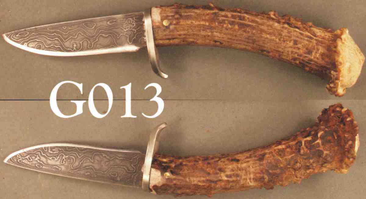 Handle Characteristics Grip Material: Crown Antler Grip Type : Guard Fittings Material: Stainless Steel Fasteners: Pins only Dimension (inches) Length: 5.25 Max Thickness: 1.63 Min Thickness: 0.885 Max Height: 1.7 Min Height: 1.11 |