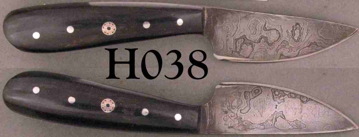 | Blade Characteristics Steel Type: Damascus Composition  : O1/L6/5160/203E/WI Billet #  : 8-Feb Number of Layers: 544 Pattern: Random Etch: Medium Polish: 600-1200 Dimension (inches) Length: 3.067 Max Thickness: 0.141 Min Thickness: 0.05 |