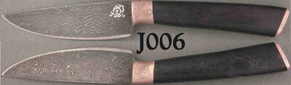 | Blade Characteristics Steel Type: Damascus Composition  : O1/L6/203E/WI Billet #  : 12/29/2009 Number of Layers: 624 Pattern: Dolly Parton & earth Mother Etch: Medium Polish: 600-1200 Dimension (inches) Length: 3.6 Max Thickness: 0.143 Min Thickness: 0.05 |
