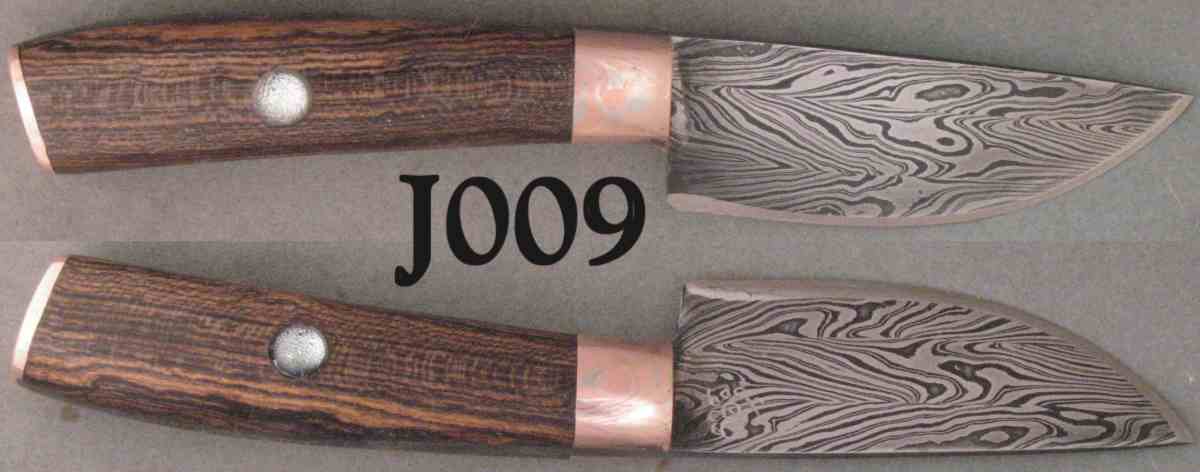 | Blade Characteristics Steel Type: Damascus Composition  : O1/L6/203E/WI Billet #  : 3/11/2010 Number of Layers: 88 Pattern: Twist Etch: Medium Polish: 600-1200 Dimension (inches) Length: 3.45 Max Thickness: 0.151 Min Thickness: 0.072 |
