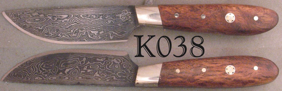 | Blade Characteristics Steel Type: Damascus Composition  : O1/L6/203E Billet #  : 4/16/2011 Number of Layers: 408 Pattern: Dolly Parton Etch: Medium Polish: 600-1200 Dimension (inches) Length: 4.2 Max Thickness: 0.15 Min Thickness: 0.07 |