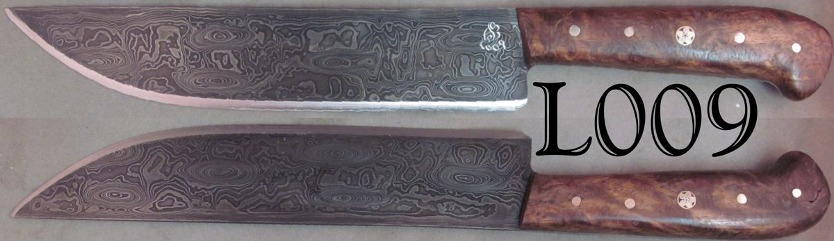 | Blade Characteristics Steel Type: Damascus Composition  : O1/L6/1095/203E/WI Billet #  : 2012-04 Number of Layers: 264 Pattern: Ball Mill Etch: Medium Polish: Satin Dimension (inches) Length: 8.1 Max Thickness: 0.123 Min Thickness: 0.07 |