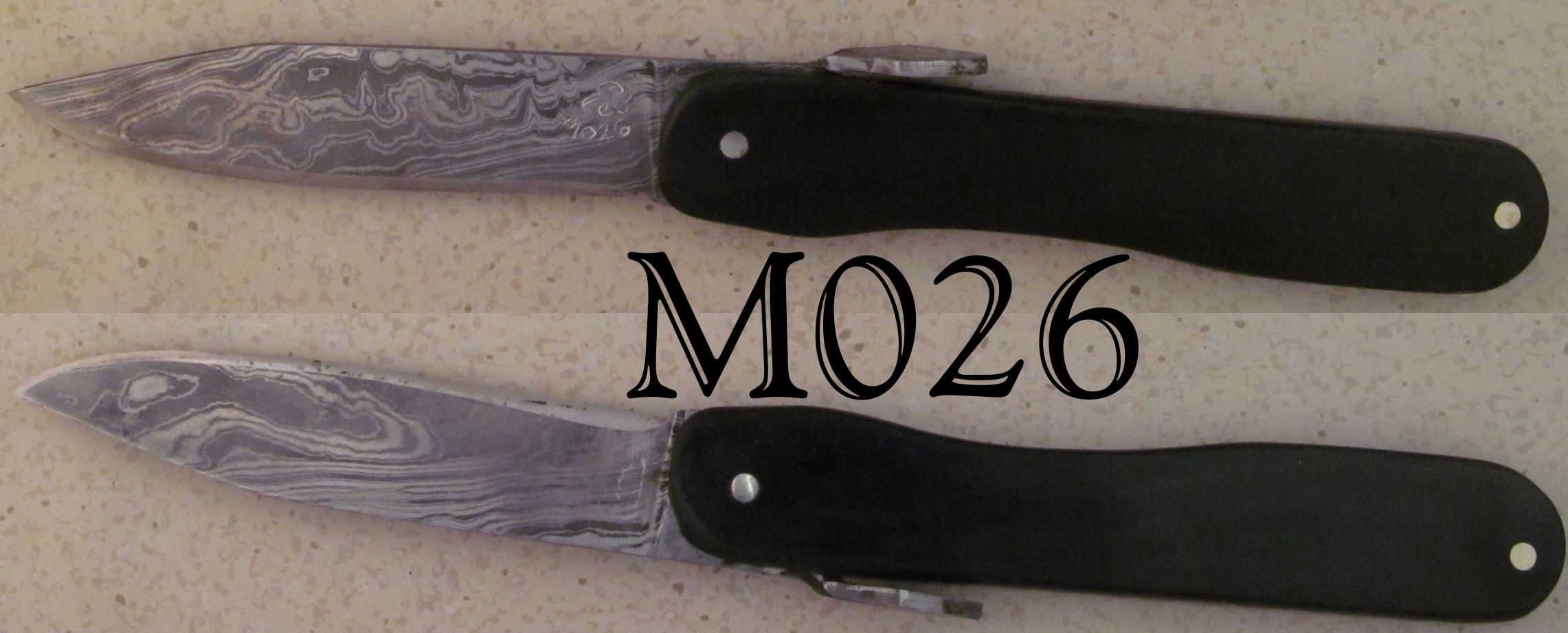 | Blade Characteristics Steel Type: Damascus Composition  : O1/L6/1095/203E/WI Billet #  : 1/3/2012 Number of Layers: 104 Pattern: Twist Etch: Medium Polish: 600-1200 Dimension (inches) Length: 3.6 Max Thickness: 0.9 Min Thickness: 0.069 |