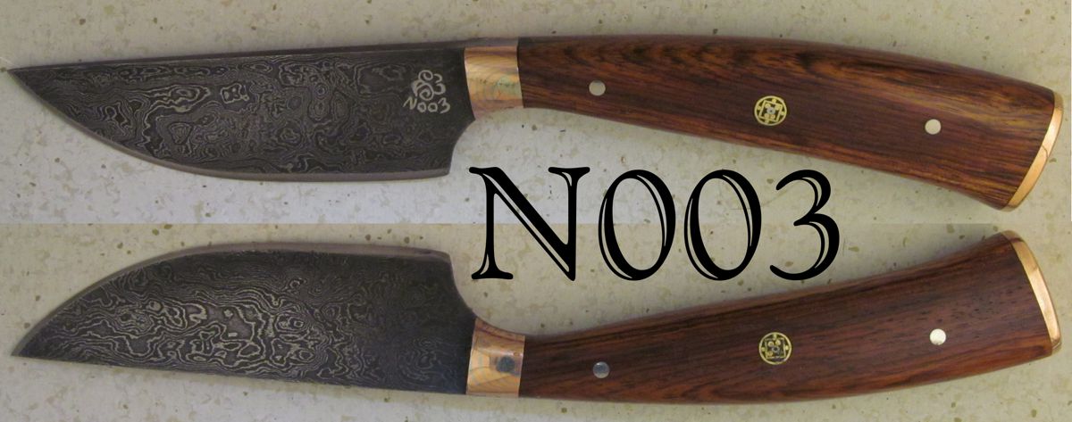 | Blade Characteristics Steel Type: Damascus Composition  : O1/L6 Billet #  : N002 Number of Layers: 270 Pattern: Dolly Parton Etch: Medium Polish: Satin Dimension (inches) Length: 3.75 Max Thickness: 0.174 Min Thickness: 0.076 |