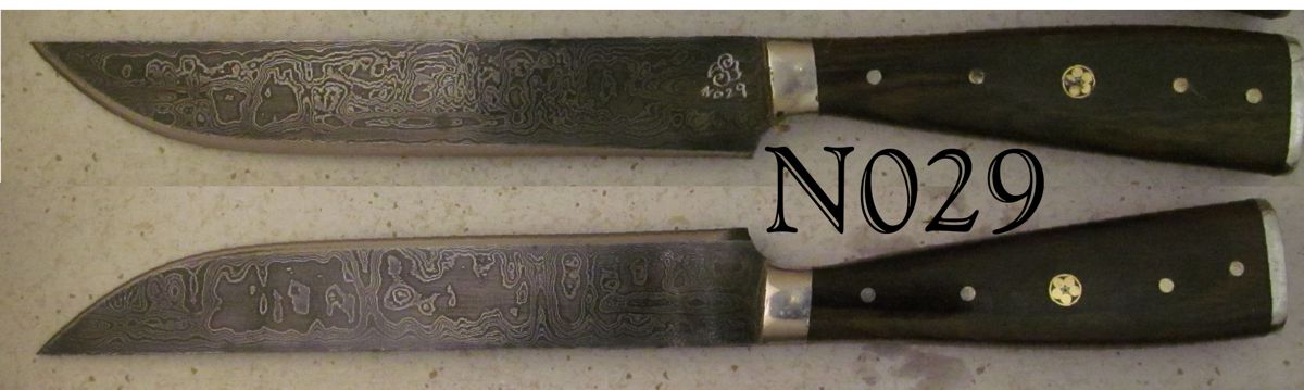 | Blade Characteristics Steel Type: Damascus Composition  : O1/L6/1095 Billet #  : N03 Number of Layers: 162 Pattern: Dolly Parton Etch: Medium Polish: Satin Dimension (inches) Length: 6.8 Max Thickness: 0.112 Min Thickness: 0.085 |
