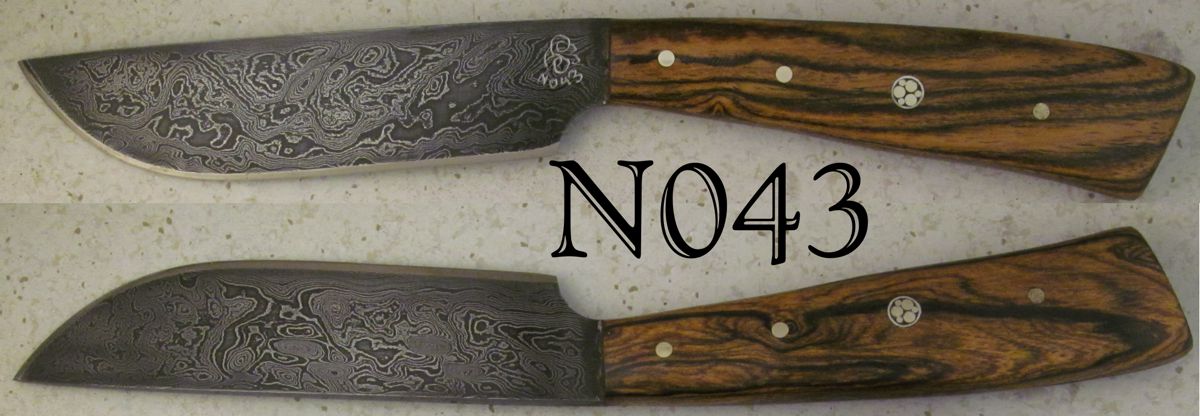 | Blade Characteristics Steel Type: Damascus Composition  : O1/L6 Billet #  : M002 Number of Layers: 264 Pattern: Dolly Parton Etch: Medium Polish: 600-1200 Dimension (inches) Length: 4.9 Max Thickness: 0.168 Min Thickness: 0.083 |