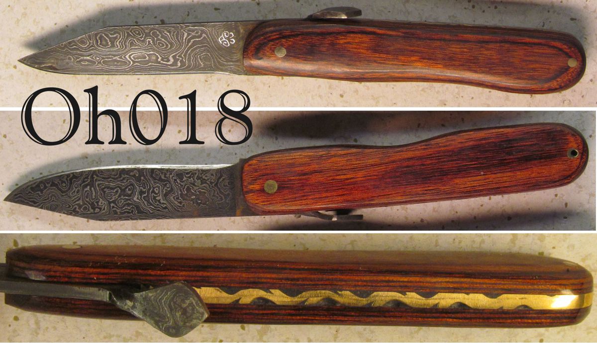 | Blade Characteristics Steel Type: Damascus Composition  : O1/L6/203E Billet #  : Oh01 Number of Layers: 318 Pattern: Random Etch: Medium Polish: 600-1200 Dimension (inches) Length: 3.35 Max Thickness: 0.095 Min Thickness: 0.052 |