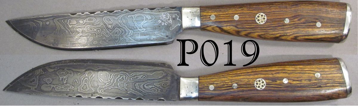 | Blade Characteristics Steel Type: Damascus Composition  : O1/L6/1095/1084 Billet #  : P02 Number of Layers: 264 Pattern: Random Etch: Medium Polish: Satin Dimension (inches) Length: 5.0 Max Thickness: 0.148 Min Thickness: 0.09 |