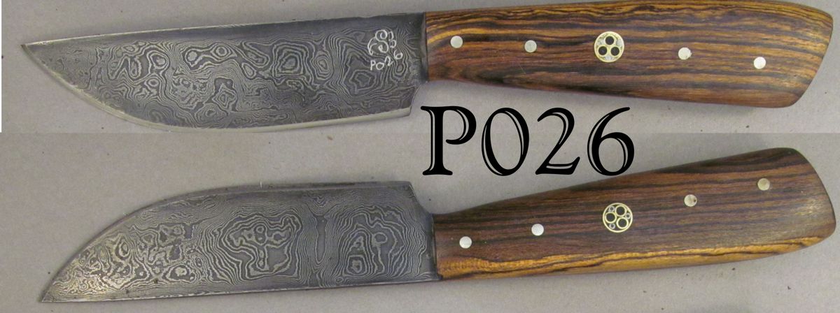 | Blade Characteristics Steel Type: Damascus Composition  : O1/L6/52100 Billet #  : P05 Number of Layers: 312 Pattern: Dolly Parton Etch: Medium Polish: Satin Dimension (inches) Length: 4.4 Max Thickness: 0.168 Min Thickness: 0.07 |