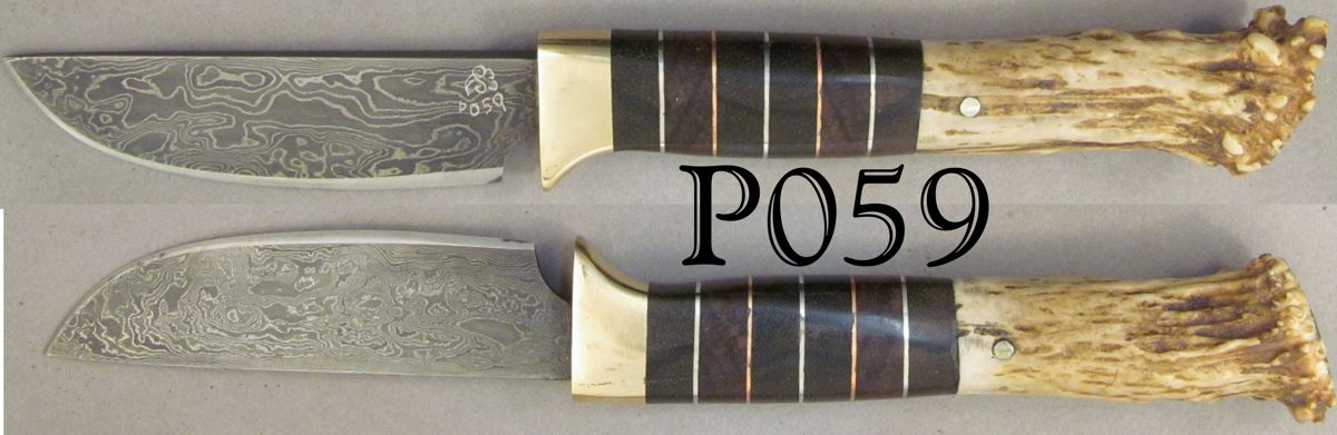 | Blade Characteristics Steel Type: Damascus Composition  : O1/L6 Billet #  : ? Number of Layers: ~300 Pattern: Dolly Parton Etch: Medium Polish: Satin Dimension (inches) Length: 3.5 Max Thickness: 0.19 Min Thickness: 0.065 |