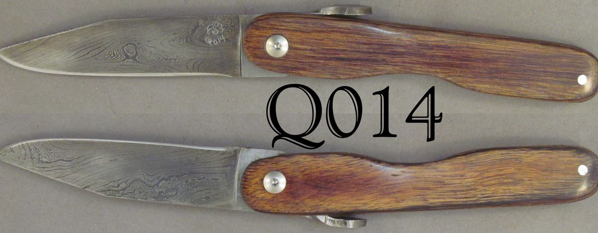 | Blade Characteristics Steel Type: Damascus Composition  : O1/L6 Billet #  : Q01B Number of Layers: 528 Pattern: Twist Etch: Medium Polish: Satin Dimension (inches) Length: 3.3 Max Thickness: 0.102 Min Thickness: 0.05 |