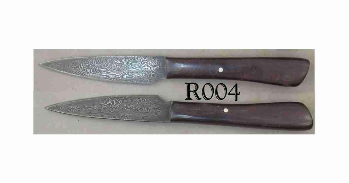 | Blade Characteristics Steel Type: Damascus Composition  : O1/L6 Billet #  : R01 Number of Layers: 264 Pattern: Dolly Parton Etch: Medium Polish: Satin Dimension (inches) Length: 3.9 Max Thickness: 0.088 Min Thickness: 0.065 |