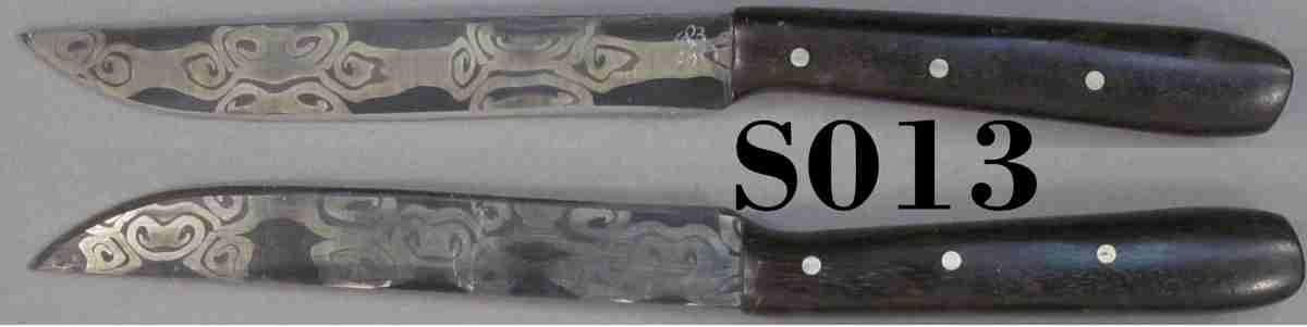 | Blade Characteristics Steel Type: "Damascus" Composition  : L6 & 1084 powder Billet #  : n/a Number of Layers: n/a Pattern: Designed Etch: Medium Polish: Satin Dimension (inches) Length: 4.55 Max Thickness: 0.142 Min Thickness: 0.09 |