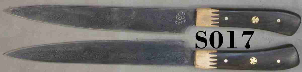 | Blade Characteristics Steel Type: Damascus Composition  : O1/L6 Billet #  : S01 Number of Layers: 204 Pattern: Dolly Parton Etch: Medium Polish: Satin Dimension (inches) Length: 7.8 Max Thickness: 0.084 Min Thickness: 0.07 |