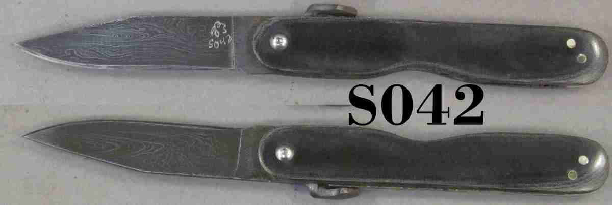 | Blade Characteristics Steel Type: Damascus Composition  : O1/L6 Billet #  : S04 Number of Layers: 288 Pattern: Random Etch: Medium Polish: Satin Dimension (inches) Length: 3.3 Max Thickness: 0.09 Min Thickness: 0.073 |