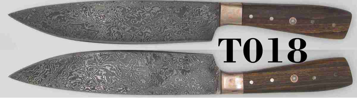 | Blade Characteristics Steel Type: "Damascus" Composition  : O1/L6 Billet #  : ? Number of Layers: 288 Pattern: Dolly Parton Etch: Medium Polish: Satin Dimension (inches) Length: 7.3 Max Thickness: 0.085 Min Thickness: 0.045 |