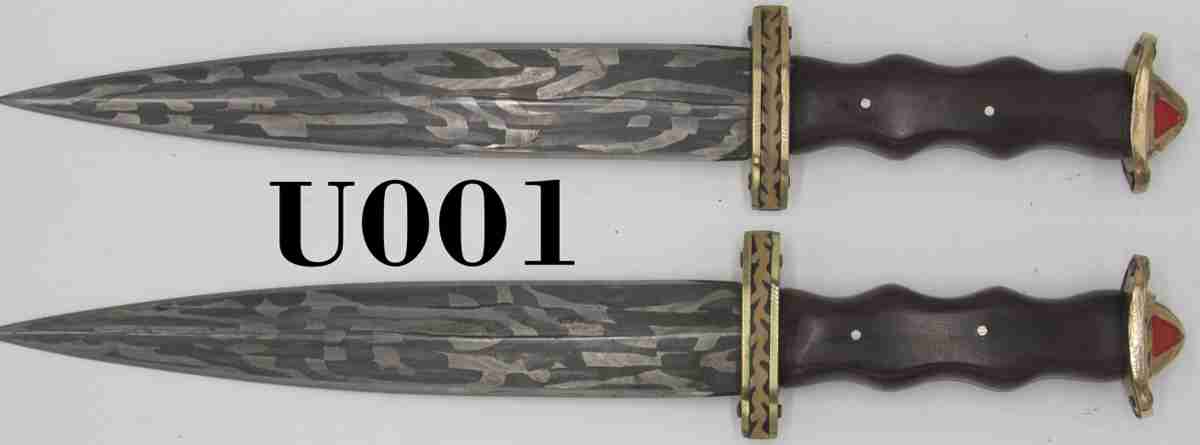 | Blade was 8 checker-board rods- each rod of (O1-15N20, then 15N20 & O1) - twisted CW and CCW with non-twisted areas between, center core of O1 with 4 rods on one side and the other 4 rods on the other side. Fittings were inspired by 7th century Anglo-Saxon blades |
