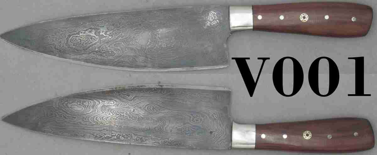 | Blade Characteristics Steel Type: Damascus Composition  : 1095-L6-8670M Billet #  : V001 Number of Layers: 196 Pattern: Random Etch: Medium Polish: Satin Dimension (inches) Length: 7.2 Max Thickness: 0.099 Min Thickness: 0.055 |