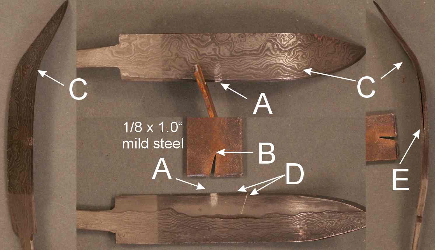 weld separation (follow the scratch at 'D' back to the interface of the O1 core and the Damascus).