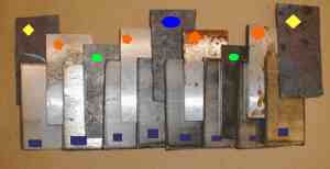 In this example, the yellow marks the wrought iron, blue the 203E, red the O1, green the 5160, and navy the L6. |