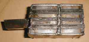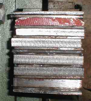 O1.All layers are separated from one another by a piece of L6. It is critical that there be sufficient carbon if the resulting blades are to function as decent cutting tools. To that end, all materials are first weighted. Knowing the weight and the carbon percentage, the carbon content of the billet can be calculated. In this examples, the weights are 1026 g O1, 560 g L6, 446 g 5160, 168 g wrought iron, and 96 g 203E. The weights are multiplied by the carbon %, summed, and divided by the total weight to yield an initial carbon content of 0.74% carbon. While some carbon will be lost during the welding, there will be more than 0.60% at the end. |